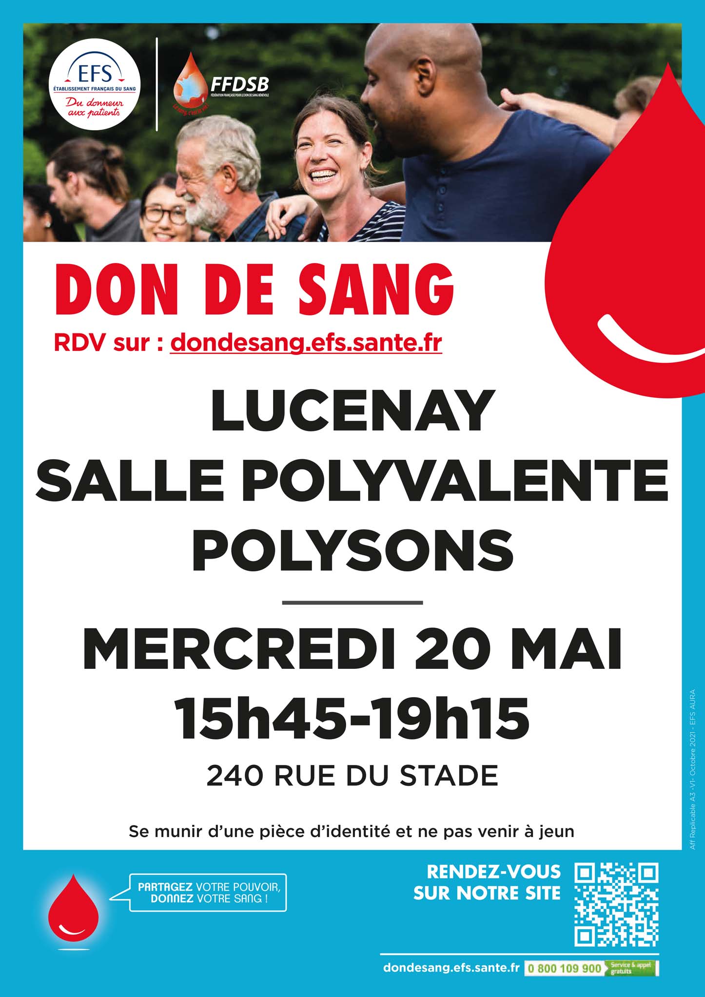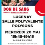 Don de sang – Salle Poly sons, 240 rue du stade – CNI 20 mai 2026 de 15 h 45 min à 19 h 15 min Agenda LUCENAY dans la SALLE POLYVALENTE POLYSONS le MERCREDI 20 MAI 2026 de 15h45 à 19h15, 240 RUE DU STADE,